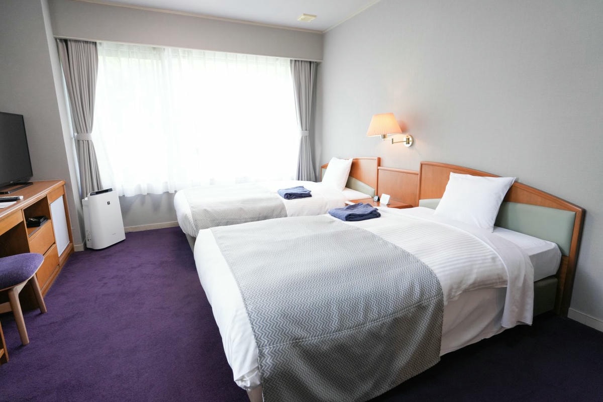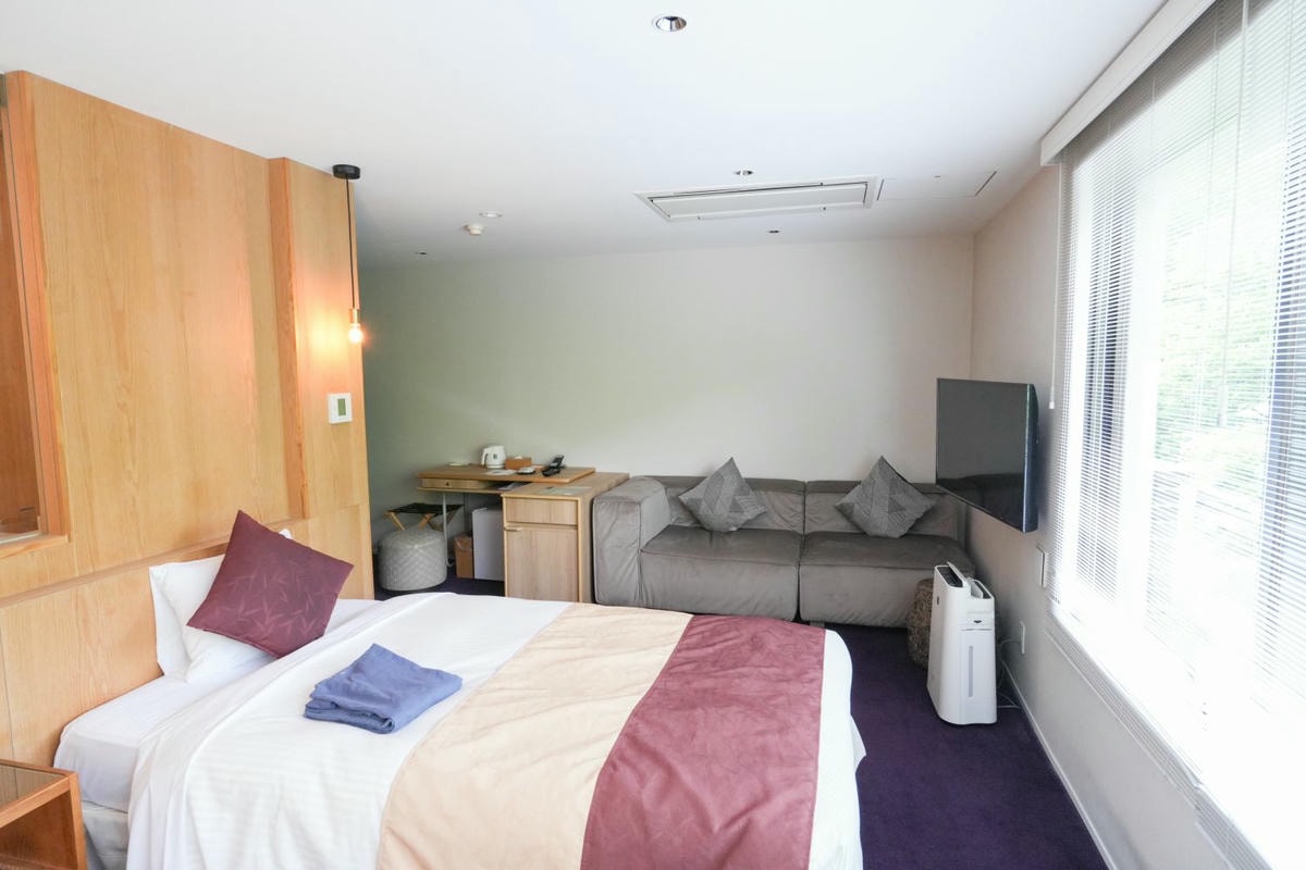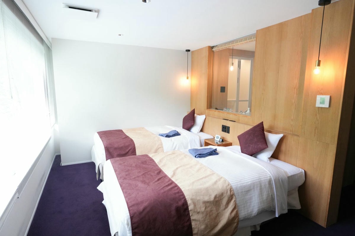 另外一間高級雙床房則是偏昭和復古風,同樣是兩張床鋪跟美麗的窗景,房間相對起來比較小一些,但整體也還是非常舒服感覺。