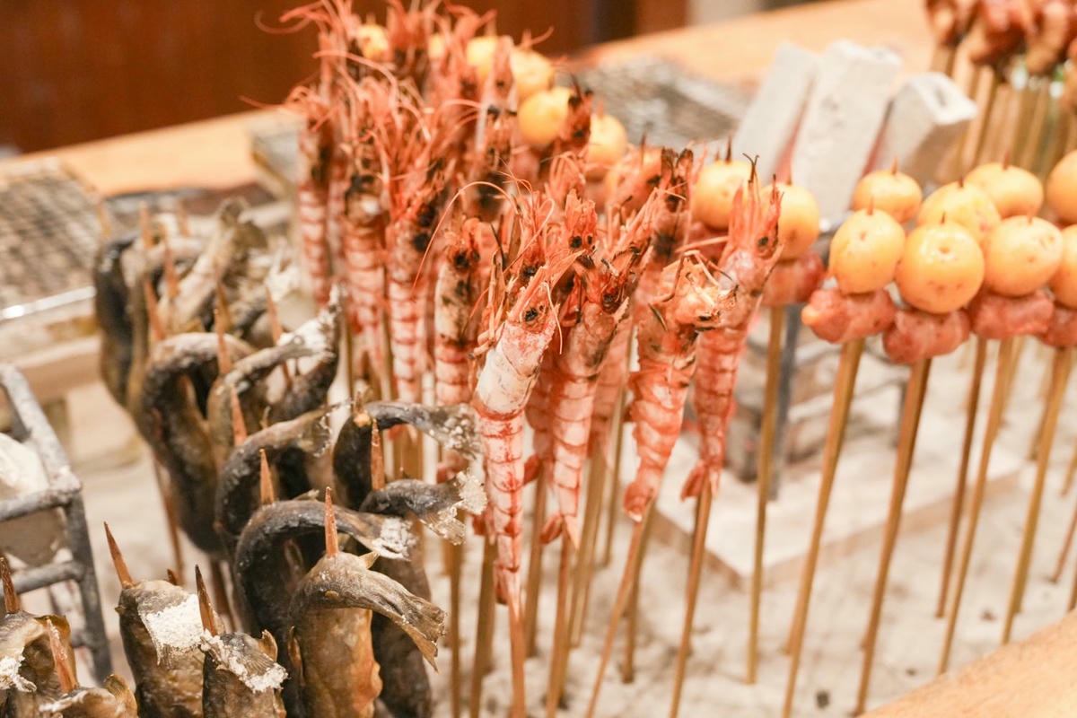 餐廳會場中央設有炭火圍爐,炭火燒烤的香氣四溢。可以品嚐到湯西川的名產如板台餅、岩魚、豆皮、蔬菜、雞肉丸,以及用秘傳醬汁烤製的櫪木雞肉串燒,每一口都能享受到剛剛好的溫度與風味。